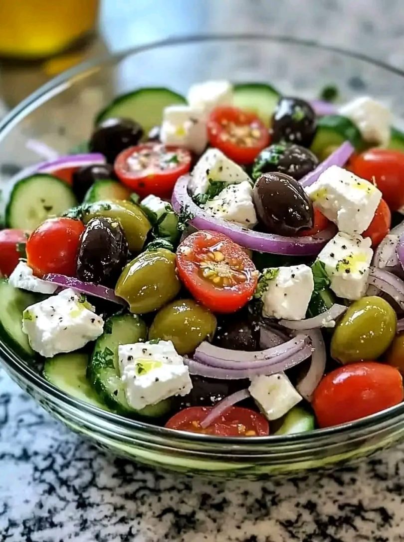 Add the Kalamata olives, green olives, and cubed feta cheese on top.