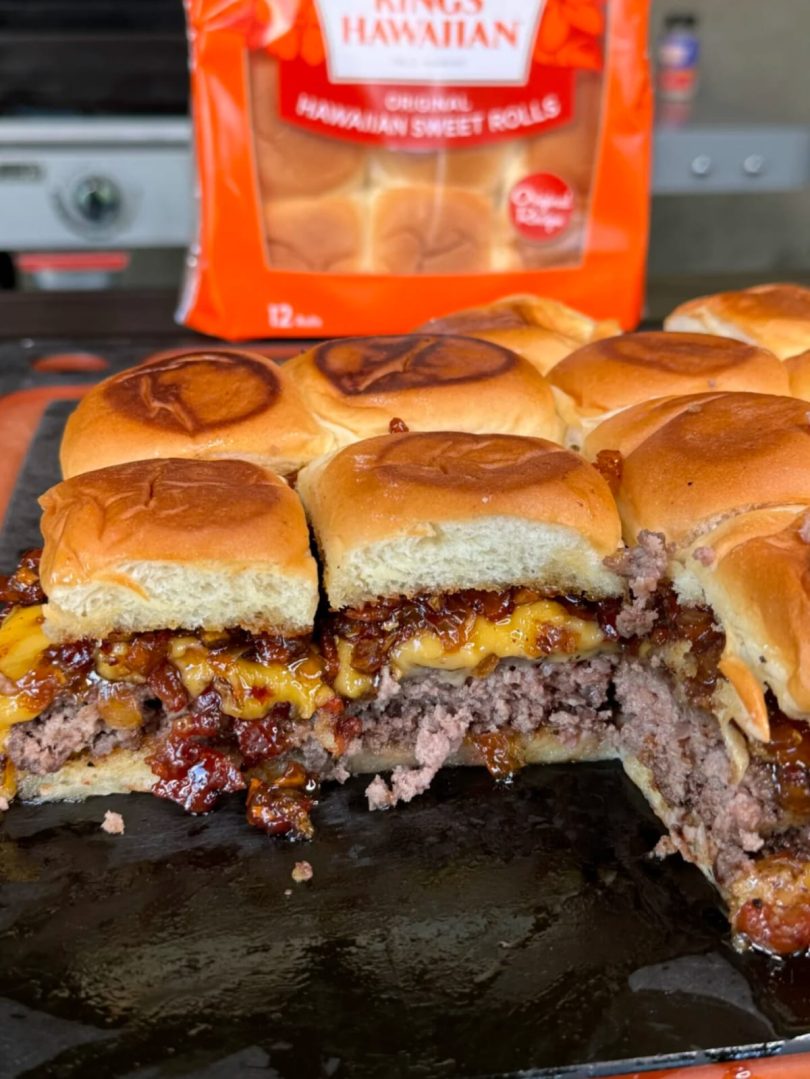 Toast buns, assemble sliders with bacon jam. Cut and serve.