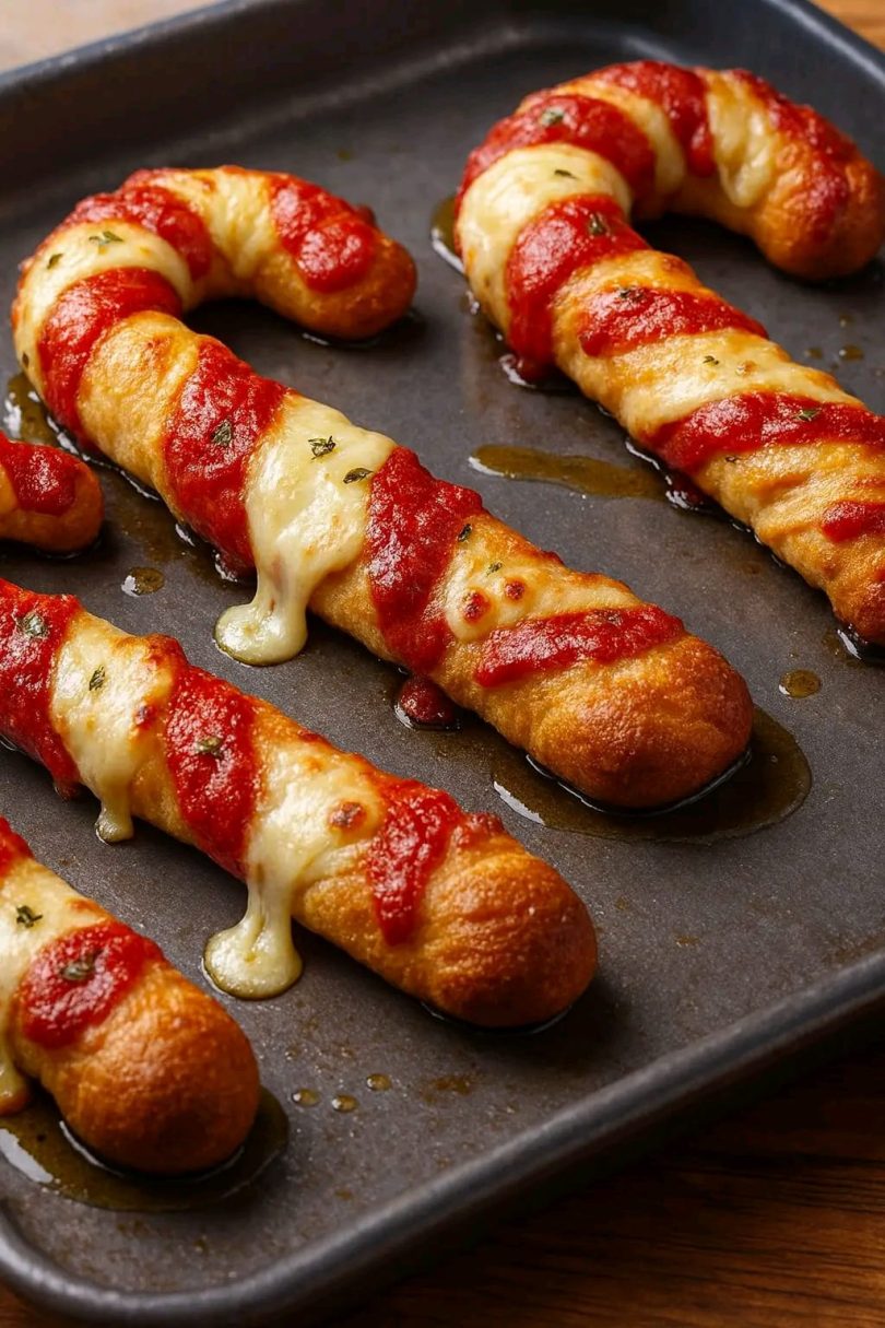 Spoon or pipe marinara sauce in diagonal stripes, alternating with the cheese to create the candy-cane look.