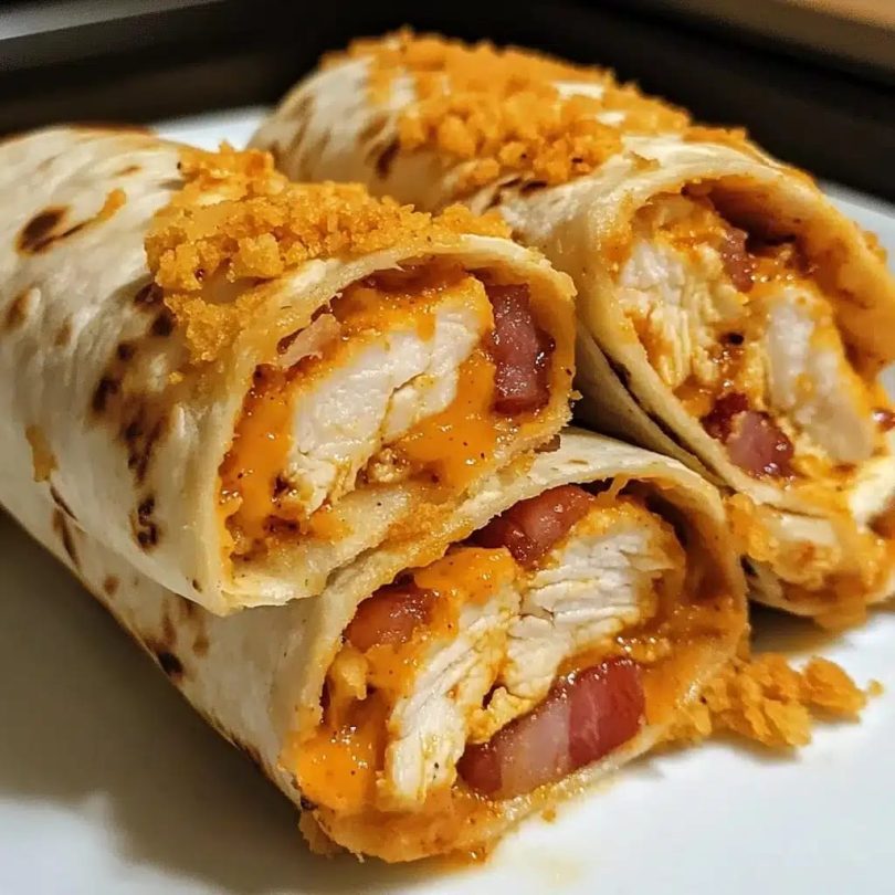 On each flour tortilla, layer the cooked chicken strips, shredded cheddar cheese, crumbled bacon, and a drizzle of ranch dressing.