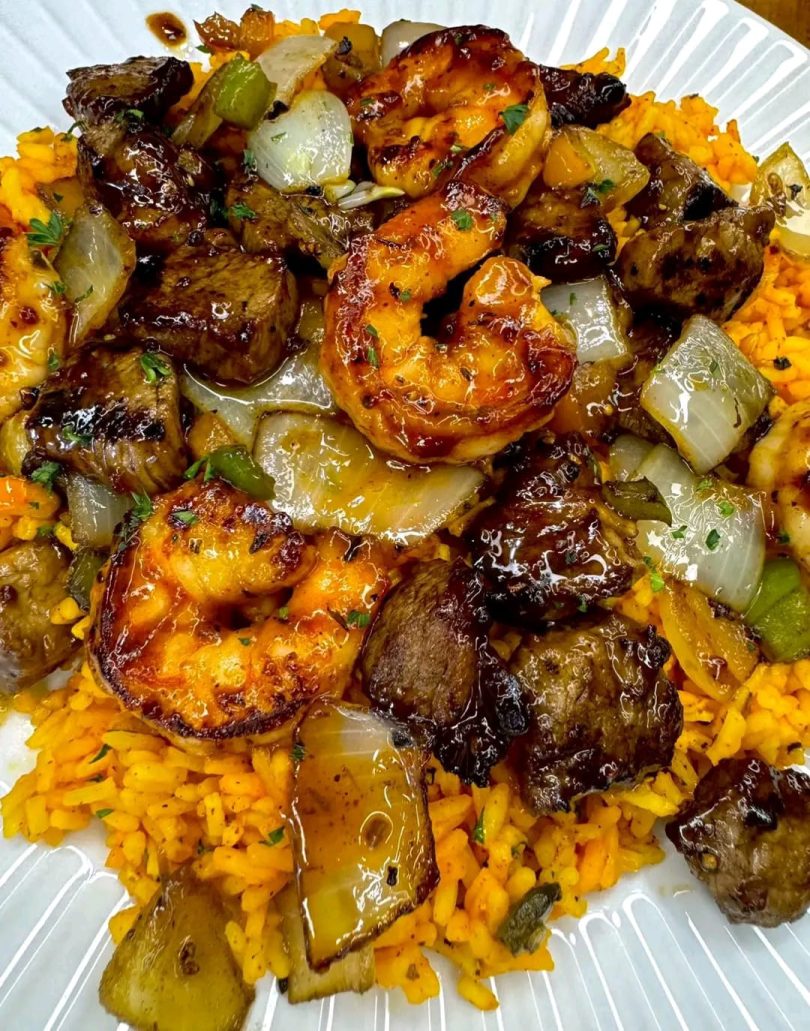 Combine and Serve: Return the cooked steak cubes to the skillet and gently stir to mix with the shrimp and peppers. Allow everything to cook together for an additional minute until fully heated through. Serve the jerk steak and shrimp mixture over the cooked yellow rice.