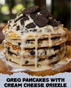 Enjoy these Oreo Pancakes with Cream Cheese Drizzle—the ultimate cookies & cream breakfast