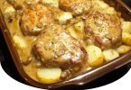 In a baking dish, combine sliced onion and cremini mushrooms. Sprinkle with paprika, oregano, salt, and pepper. Place the garlic head in the center, drizzle everything with olive oil, cover with foil, and bake for 20-25 minutes.
