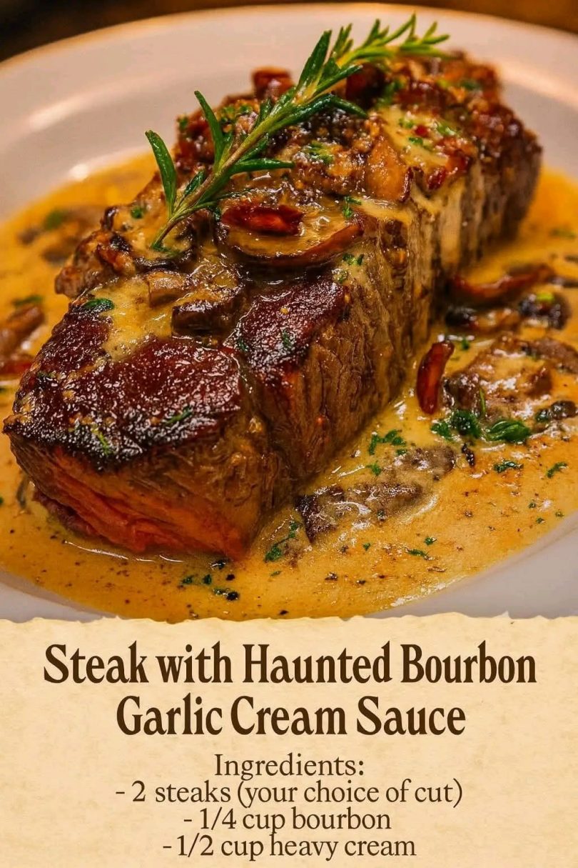 Steak with Haunted Bourbon Garlic Cream Sauce